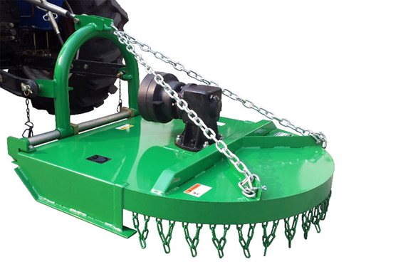 When you need a mower that is great for cutting and clearing grass, weeds and even brush up to 1 1/2” in diameter the FH-RGC mower is a great option. You can adjust the offset by sliding the 3-pt mount left or right. This allows you to get closer to and/or under objects and trees. The offset is up to 6” left or right of center. This mower is for tractors 15 – 30 horsepower. It has a round back for close quarter cutting. The heat treated alloy steel blades swing back when they hit something solid that they cannot cut. Breakaway blades and shear bolt protection are also part of the safety features of this mower. T Safety chains are installed to reduce the danger of objects being thrown by the cutting blades. A free flex top link connection provides for easy hook-up. This permits the deck to follow the terrain for an even cut. Free flex, floating design with skids allows mower to adjust to and follow contour of your ground providing an even cut.