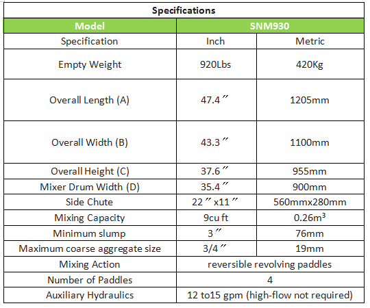 The SNM930 Concrete Mixer combines the advantages of a loader and a concrete mixer into one piece of equipment. This unique product provides the most efficient and economical way to produce small quantities of thoroughly mixed concrete, transport it to often “difficult to reach” pour sites, and then put it in place.